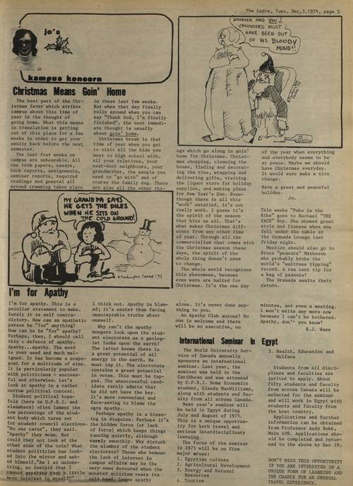 Title The Cadre -- 1974-12-03 -- Page 5 Date Issued 1974-12-03 Language English Type Text Genre Page Extent 1 page Rights This material has been made available for research, education, and private use only. Publication, distribution or commercial use of the material requires permission from the copyright holder. Member of The Cadre -- 1974-12-03 Digitization Agency Robertson Library, UPEI Reel Sequence Number 0145 Page Number 5 Owning Repository Robertson Library, UPEI