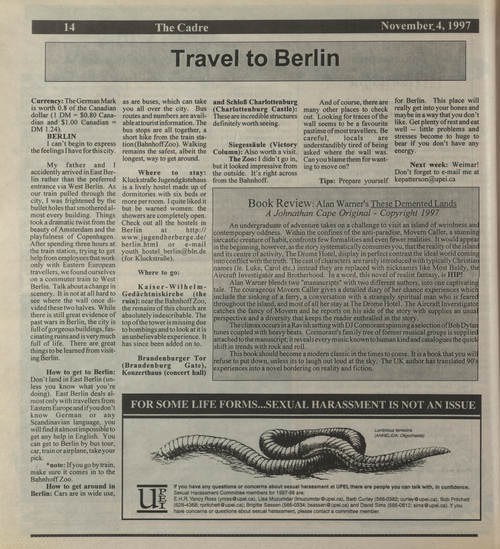 Title The Cadre -- 1997-11-04 -- Page 14 Date Issued 1997-11-04 Language English Type Text Genre Page Extent 1 page Rights This material has been made available for research, education, and private use only. Publication, distribution or commercial use of the material requires permission from the copyright holder. Member of The Cadre -- 1997-11-04 Digitization Agency Robertson Library, UPEI Owning Repository Robertson Library, UPEI