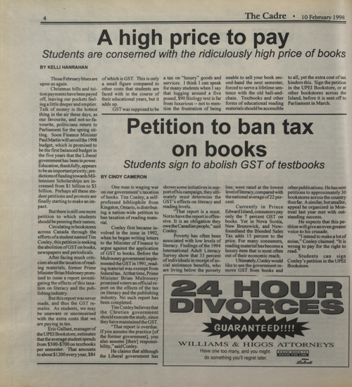 Title The Cadre -- 1998-02-10 -- Page 4 Date Issued 1998-02-10 Language English Type Text Genre Page Extent 1 page Rights This material has been made available for research, education, and private use only. Publication, distribution or commercial use of the material requires permission from the copyright holder. Member of The Cadre -- 1998-02-10 Digitization Agency Robertson Library, UPEI Owning Repository Robertson Library, UPEI