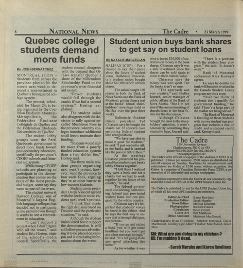 Title The Cadre -- 1999-03-23 -- Page 8 Date Issued 1999-03-23 Language English Type Text Genre Page Extent 1 page Rights This material has been made available for research, education, and private use only. Publication, distribution or commercial use of the material requires permission from the copyright holder. Member of The Cadre -- 1999-03-23 Digitization Agency Robertson Library, UPEI