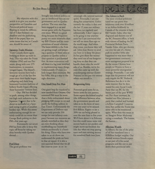 Title The Cadre -- 1999-09-21 -- Page 21 Date Issued 1999-09-21 Language English Type Text Genre Page Extent 1 page Rights This material has been made available for research, education, and private use only. Publication, distribution or commercial use of the material requires permission from the copyright holder. Member of The Cadre -- 1999-09-21 Digitization Agency Robertson Library, UPEI