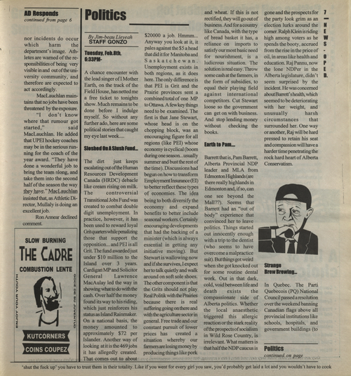 Title The Cadre -- 2000-02-10 -- Page 7 Date Issued 2000-02-10 Language English Type Text Genre Page Extent 1 page Rights This material has been made available for research, education, and private use only. Publication, distribution or commercial use of the material requires permission from the copyright holder. Member of The Cadre -- 2000-02-10 Digitization Agency Robertson Library, UPEI