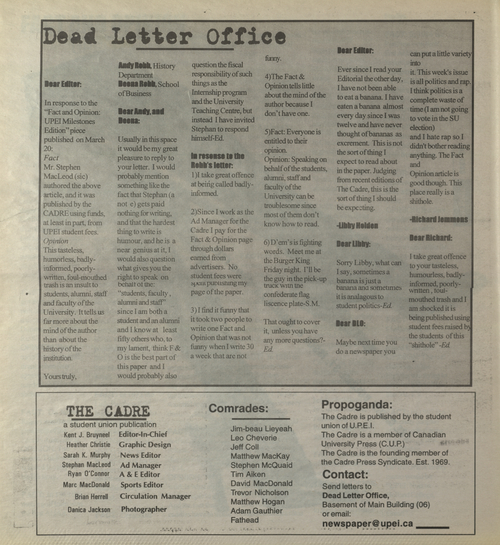 Title The Cadre -- 2000-03-25 -- Page 2 Date Issued 2000-03-25 Language English Type Text Genre Page Extent 1 page Rights This material has been made available for research, education, and private use only. Publication, distribution or commercial use of the material requires permission from the copyright holder. Member of The Cadre -- 2000-03-25 Digitization Agency Robertson Library, UPEI