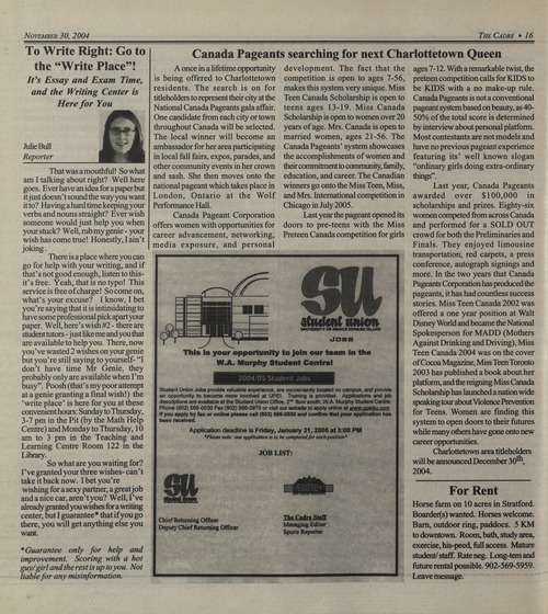 Title The Cadre -- 2004-11-30 -- Page 16 Date Issued 2004-11-30 Language English Type Text Genre Page Extent 1 page Rights This material has been made available for research, education, and private use only. Publication, distribution or commercial use of the material requires permission from the copyright holder. Member of The Cadre -- 2004-11-30 Digitization Agency Robertson Library, UPEI
