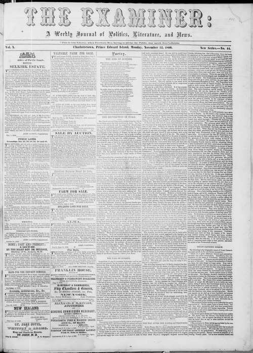 Title Examiner -- 1860-11-12 Date Issued 1860-11-12 Language English Type Text Genre Issue Rights Digitized with permission. For educational, research and study purposes. Member of Examiner Digitization Agency West Canadian Digital Imaging Inc. Issue 44 Volume 10