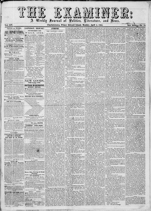 Title Examiner -- 1864-04-04 Date Issued 1864-04-04 Language English Type Text Genre Issue Rights Digitized with permission. For educational, research and study purposes. Member of Examiner Digitization Agency West Canadian Digital Imaging Inc. Issue 18 Volume 14