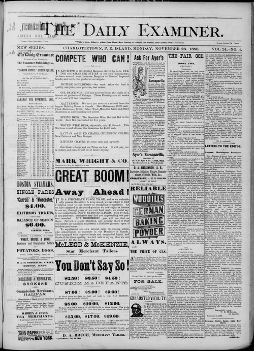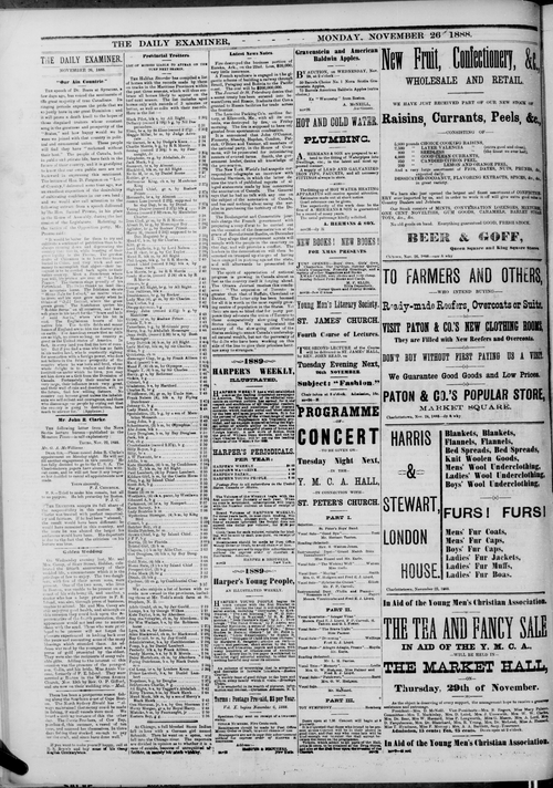 Title Examiner -- 1888-11-26 Date Issued 1888-11-26 Language English Type Text Genre Issue Rights Digitized with permission. For educational, research and study purposes. Member of Examiner Digitization Agency West Canadian Digital Imaging Inc. Issue 4 Volume 24