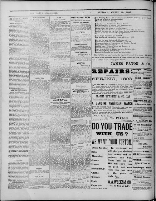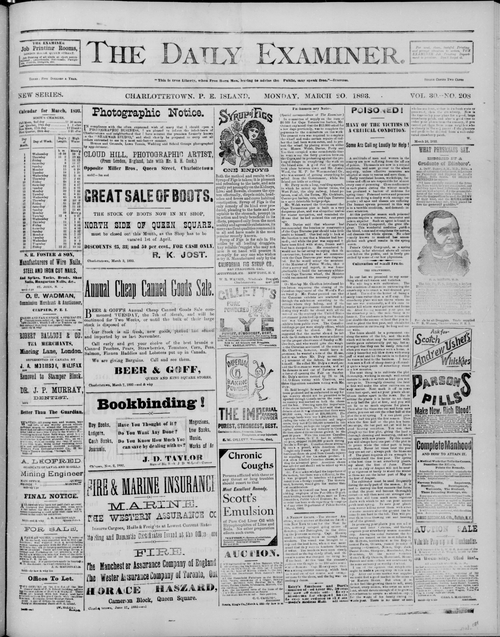 Title Examiner -- 1893-03-20 Date Issued 1893-03-20 Language English Type Text Genre Issue Rights Digitized with permission. For educational, research and study purposes. Member of Examiner Digitization Agency West Canadian Digital Imaging Inc. Issue 208 Volume 30