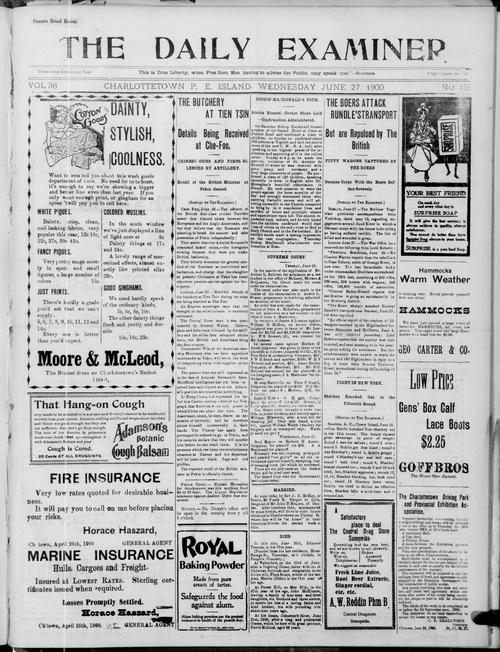 Title Examiner -- 1900-06-27 -- Page 01 Date Issued 1900-06-27 Language English Type Text Genre Page Extent 1 page Rights Digitized with permission. For educational, research and study purposes. Member of Examiner -- 1900-06-27 Digitization Agency West Canadian Digital Imaging Inc.