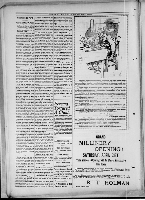Title L'Impartial -- 1900-05-24 -- Page 02 Date Issued 1900-05-24 Language French Type Text Genre Page Extent 1 page Rights Digitized with permission. For educational, research and study purposes. Member of L'Impartial -- 1900-05-24 Digitization Agency West Canadian Digital Imaging Inc.