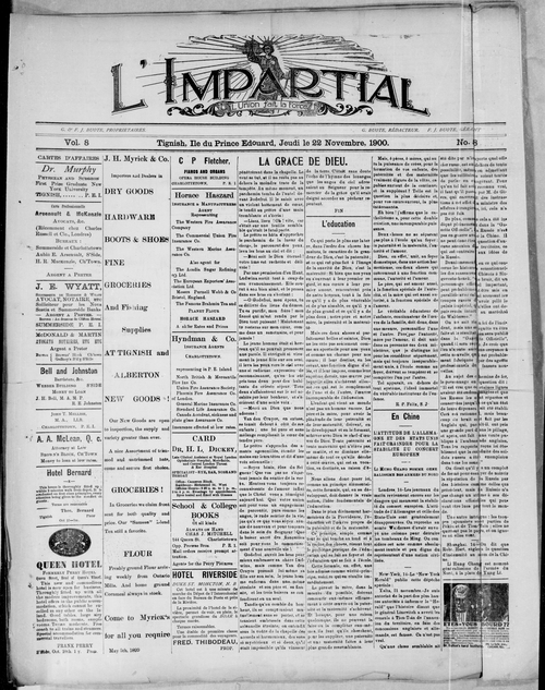 Title L'Impartial -- 1900-11-22 -- Page 01 Date Issued 1900-11-22 Language French Type Text Genre Page Extent 1 page Rights Digitized with permission. For educational, research and study purposes. Member of L'Impartial -- 1900-11-22 Digitization Agency West Canadian Digital Imaging Inc.