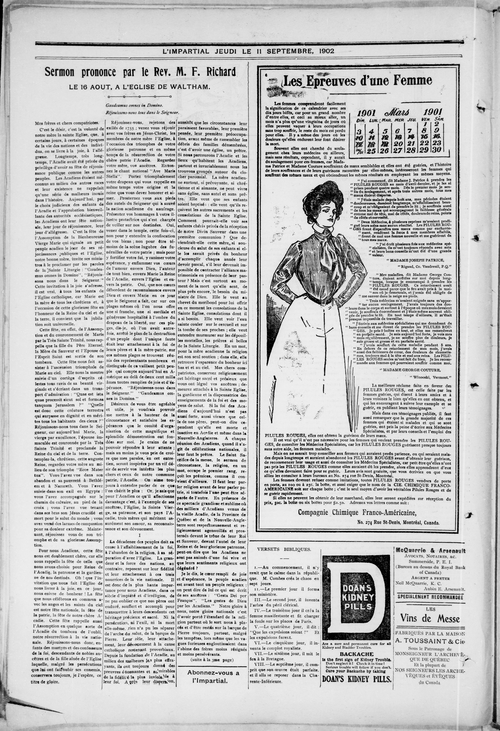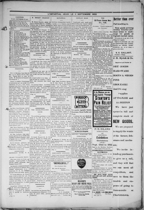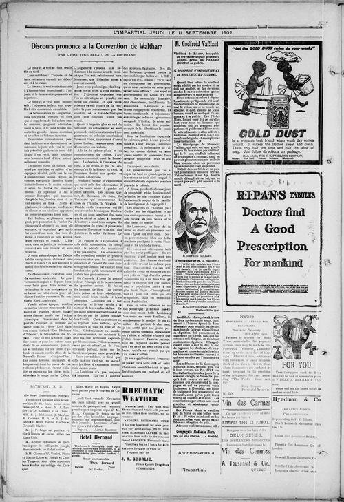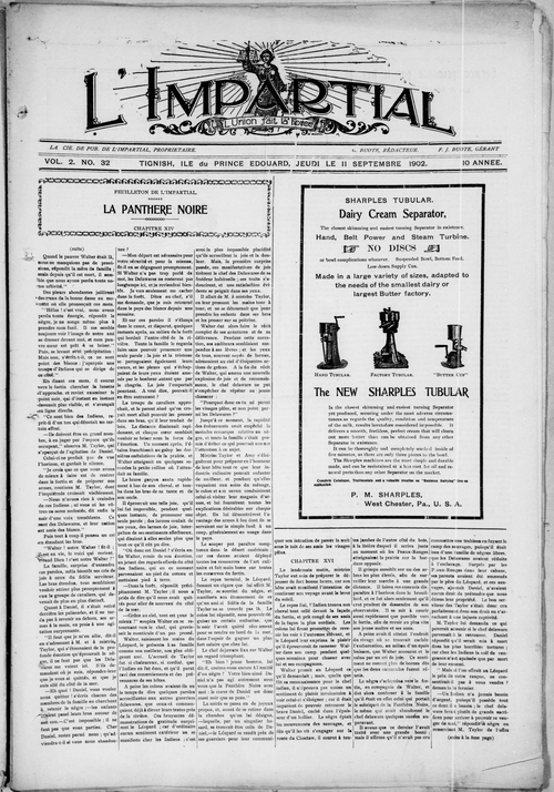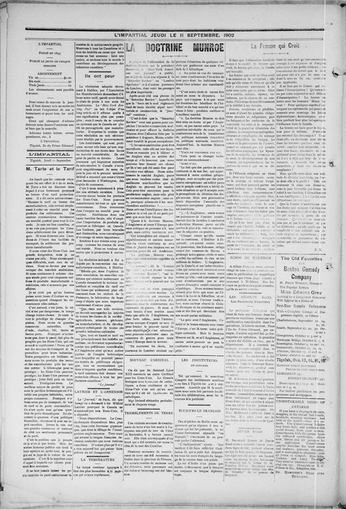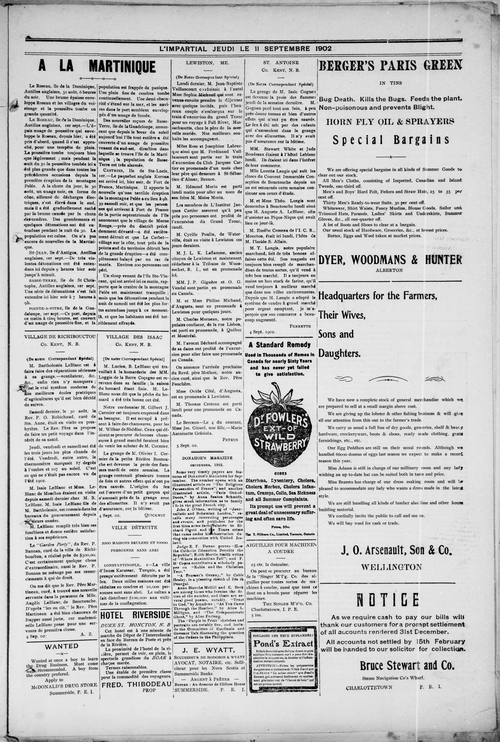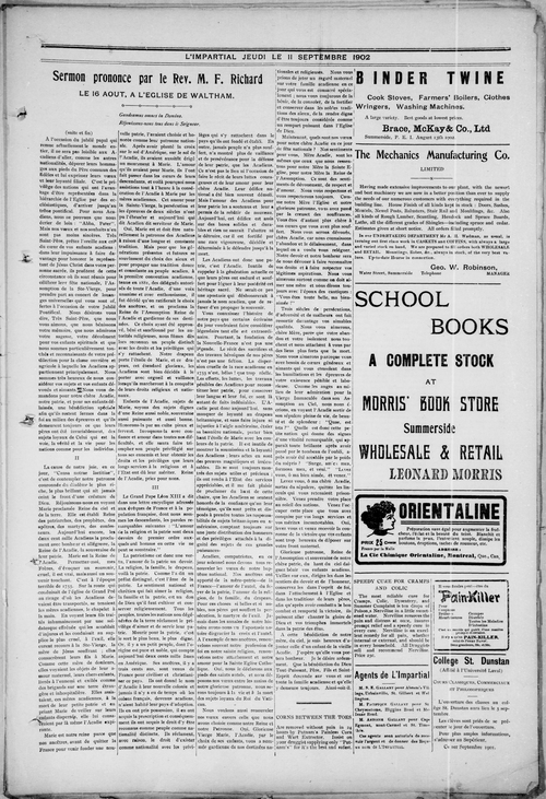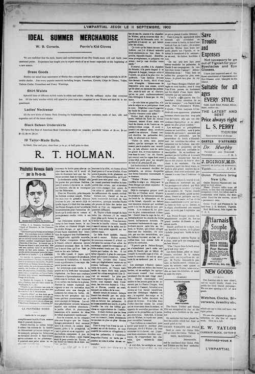 Title Impartial -- 1902-09-11 Date Issued 1902-09-11 Language French Type Text Genre Issue Rights Digitized with permission. For educational, research and study purposes. Member of L'Impartial Digitization Agency West Canadian Digital Imaging Inc. Issue 32 Volume 2