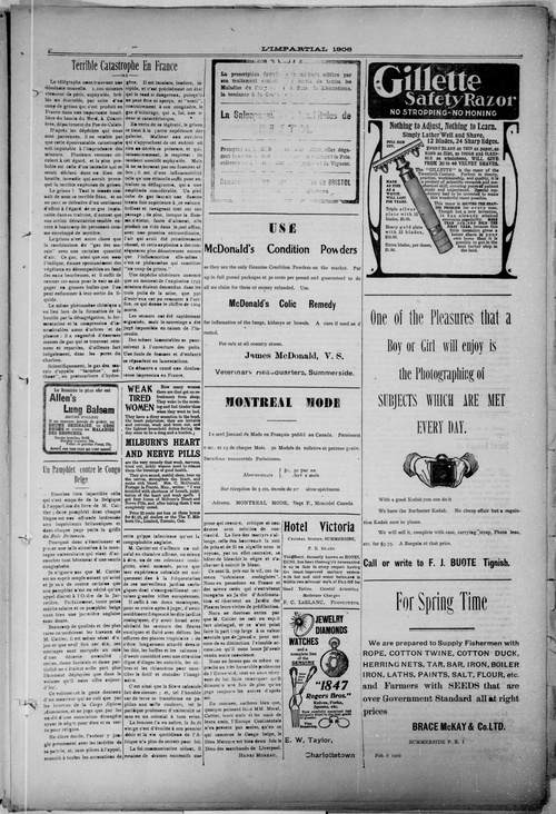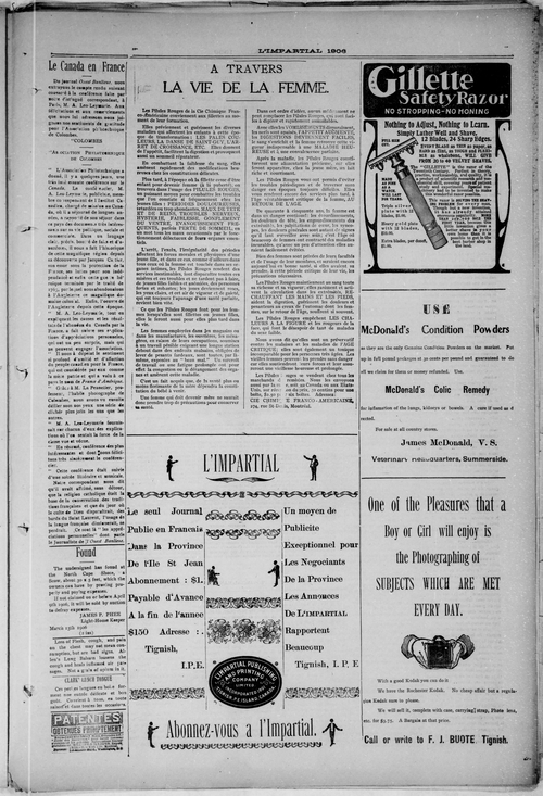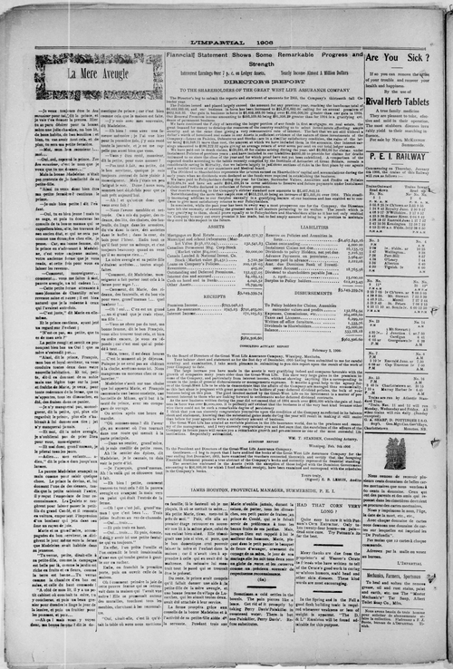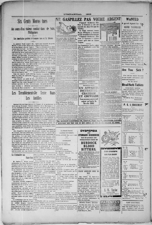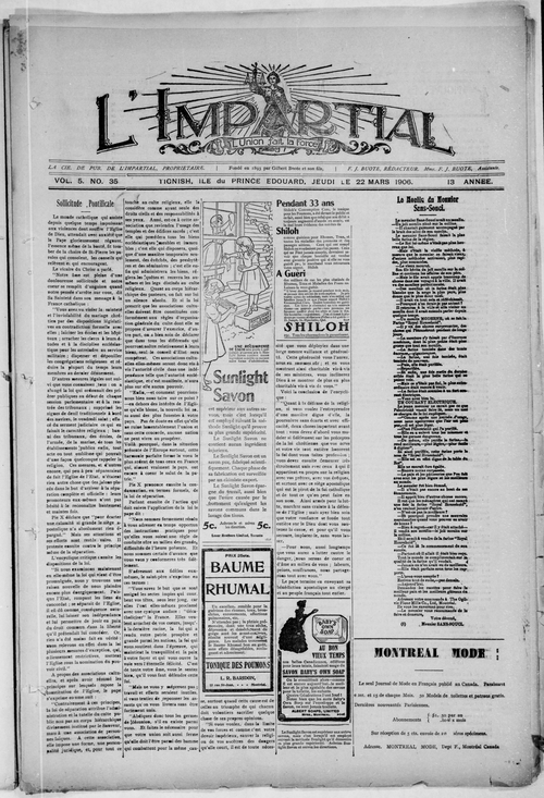 Title Impartial -- 1906-03-22 Date Issued 1906-03-22 Language French Type Text Genre Issue Rights Digitized with permission. For educational, research and study purposes. Member of L'Impartial Digitization Agency West Canadian Digital Imaging Inc. Issue 35 Volume 5