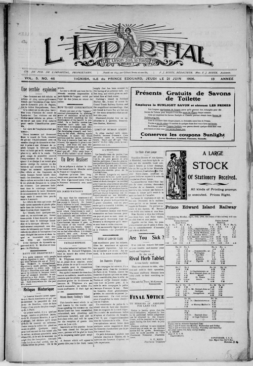 Title Impartial -- 1906-06-21 -- Page 01 Date Issued 1906-06-21 Language French Type Text Genre Page Extent 1 page Rights Digitized with permission. For educational, research and study purposes. Member of Impartial -- 1906-06-21 Digitization Agency West Canadian Digital Imaging Inc.