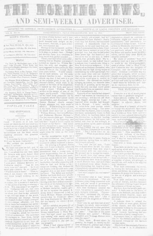 Title Morning News and Sem-Weekly Advertiser -- 1845-05-14 Date Issued 1845-05-14 Language English Type Text Genre Issue Rights This material has been made available for research, education, and private use only. Publication, distribution or commercial use of the material requires permission from the copyright holder. Member of Morning News and Semi-Weekly Advertiser Digitization Agency Robertson Library, UPEI Issue 73 Volume 2