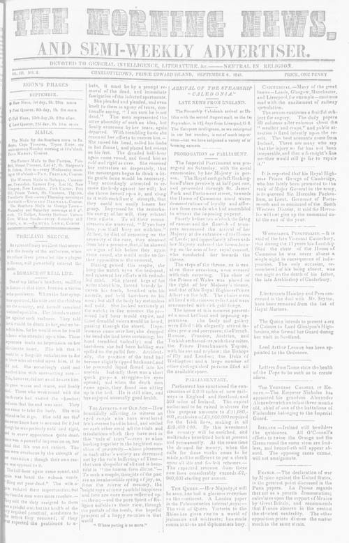 Title Morning News and Sem-Weekly Advertiser -- 1845-09-06 -- Page 1 Date Issued 1845-09-06 Language English Type Text Genre Page Extent 1 page Rights This material has been made available for research, education, and private use only. Publication, distribution or commercial use of the material requires permission from the copyright holder. Member of Morning News and Sem-Weekly Advertiser -- 1845-09-06 Digitization Agency Robertson Library, UPEI Reel Number 1 Reel Sequence Number 0755 Page Number 1 Owning Repository Robertson Library, UPEI