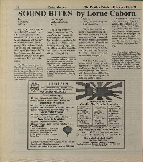 Title Panther Prints -- 1996-02-13 -- Page 14 Date Issued 1996-02-13 Language English Type Text Genre Page Extent 1 page Rights This material has been made available for research, education, and private use only. Publication, distribution or commercial use of the material requires permission from the copyright holder. Member of Panther Prints -- 1996-02-13 Digitization Agency Robertson Library, UPEI