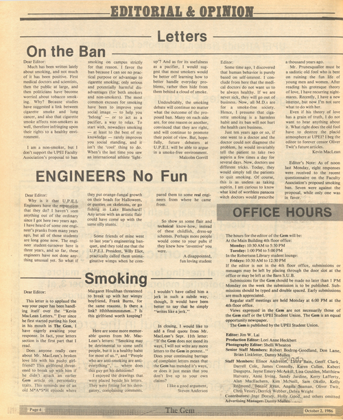 Title The Gem -- 1986-10-02 -- Page 4 Date Issued 1986-10-02 Language English Type Text Genre Page Extent 1 page Rights This material has been made available for research, education, and private use only. Publication, distribution or commercial use of the material requires permission from the copyright holder. Member of The Gem -- 1986-10-02 Digitization Agency Robertson Library, UPEI