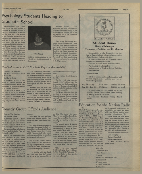 Title The Gem -- 1990-03-29 -- Page 5 Date Issued 1990-03-29 Language English Type Text Genre Page Extent 1 page Rights This material has been made available for research, education, and private use only. Publication, distribution or commercial use of the material requires permission from the copyright holder. Member of The Gem -- 1990-03-29 Digitization Agency Robertson Library, UPEI