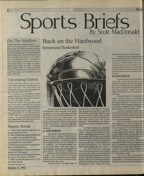 Title X-Press -- 1994-10-11 -- Page 6 Date Issued 1994-10-11 Language English Type Text Genre Page Extent 1 page Rights This material has been made available for research, education, and private use only. Publication, distribution or commercial use of the material requires permission from the copyright holder. Member of X-Press -- 1994-10-11 Digitization Agency Robertson Library, UPEI