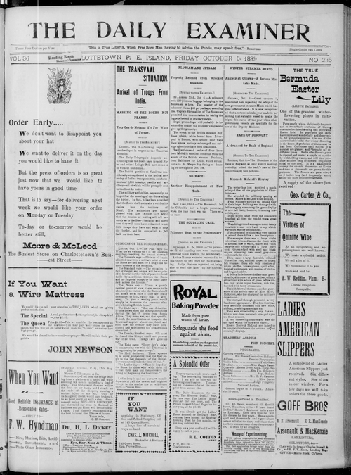 Title Examiner -- 1899-10-06 Date Issued 1899-10-06 Language English Type Text Genre Issue Rights Digitized with permission. For educational, research and study purposes. Member of Examiner Digitization Agency West Canadian Digital Imaging Inc. Issue 235 Volume 39