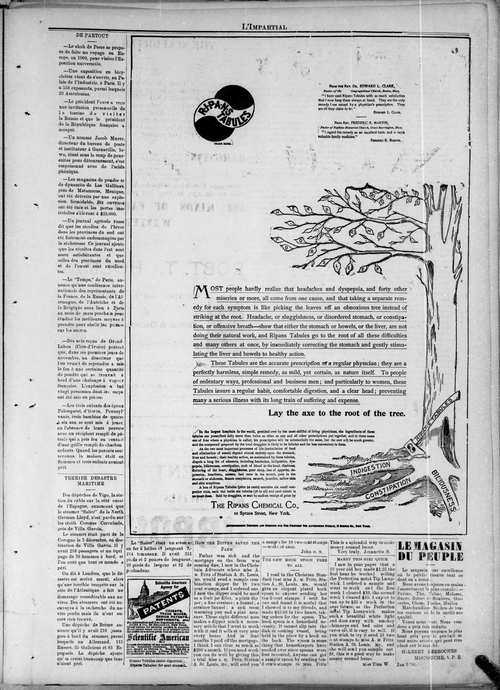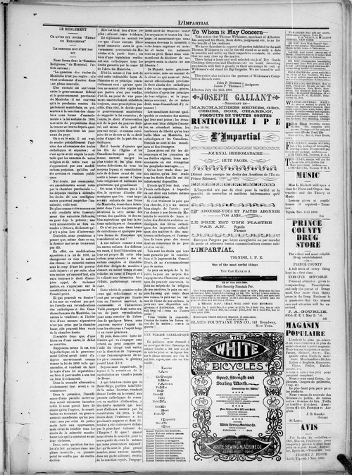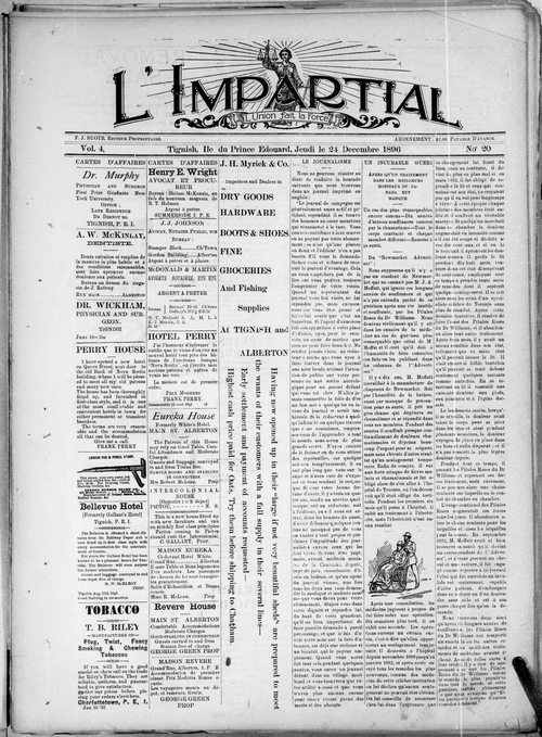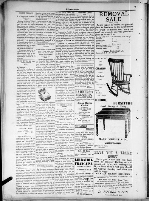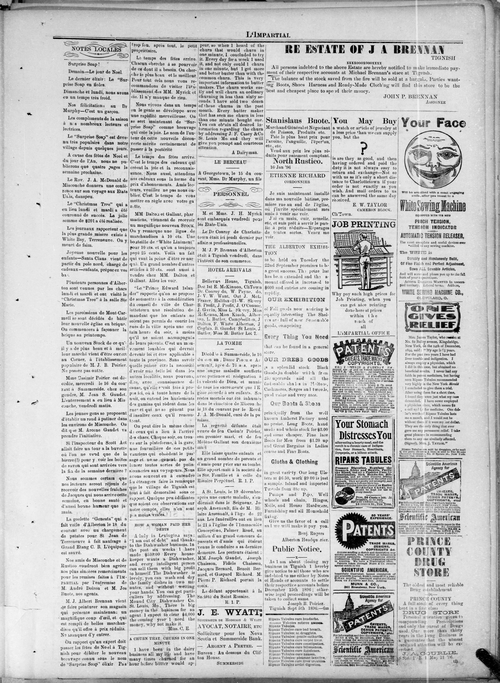 Title Impartial -- 1896-12-24 Date Issued 1896-12-24 Language French Type Text Genre Issue Rights Digitized with permission. For educational, research and study purposes. Member of L'Impartial Digitization Agency West Canadian Digital Imaging Inc. Issue 20 Volume 4