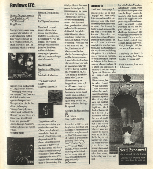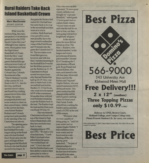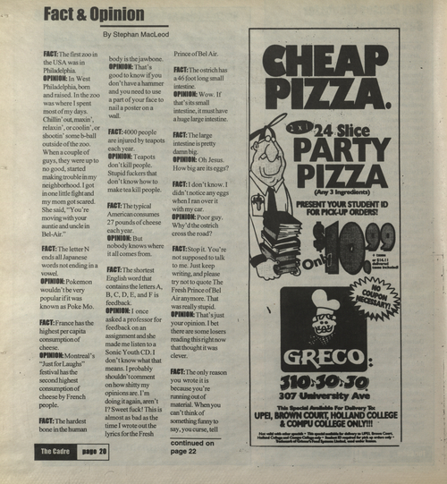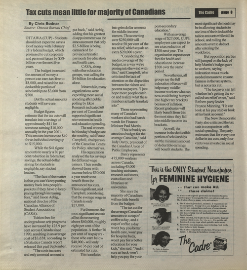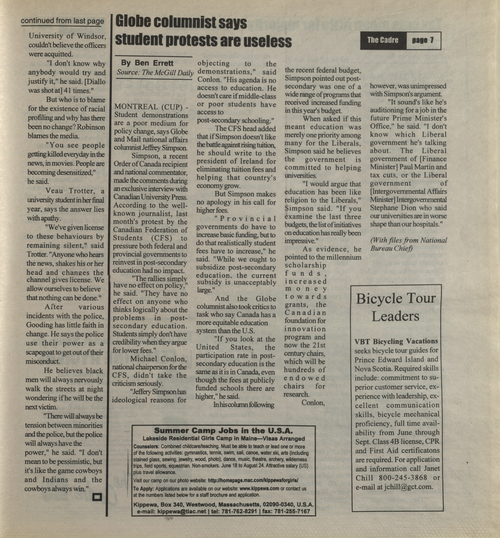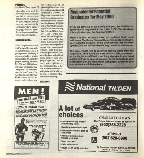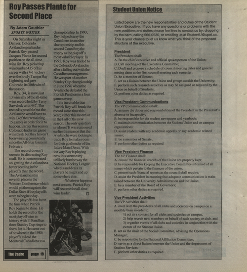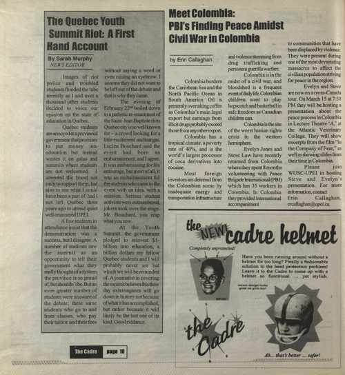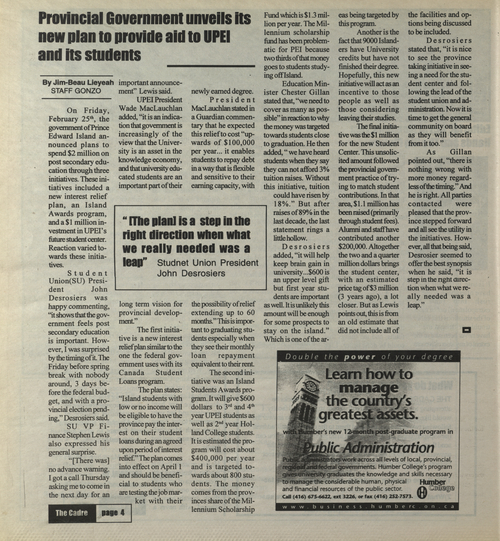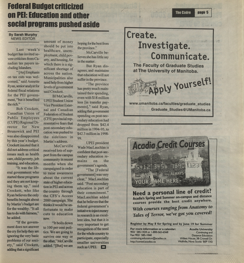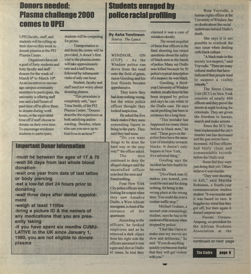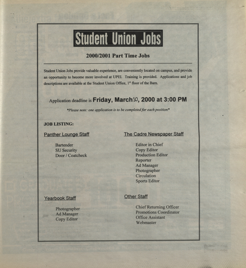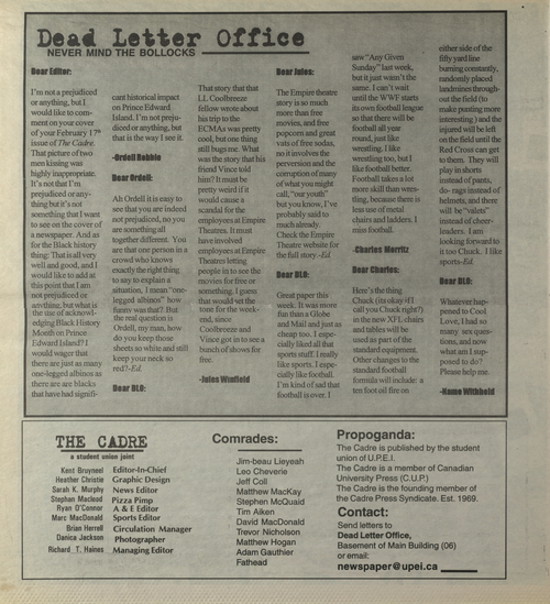 Title The Cadre -- 2000-03-10 Date Issued 2000-03-10 Language English Type Text Genre Issue Rights This material has been made available for research, education, and private use only. Publication, distribution or commercial use of the material requires permission from the copyright holder. Member of Cadre Digitization Agency Robertson Library, UPEI Issue 6 Volume 31