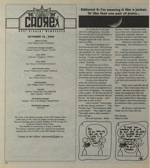 Title The Cadre -- 2002-10-16 Date Issued 2002-10-16 Language English Type Text Genre Issue Rights This material has been made available for research, education, and private use only. Publication, distribution or commercial use of the material requires permission from the copyright holder. Member of Cadre Digitization Agency Robertson Library, UPEI