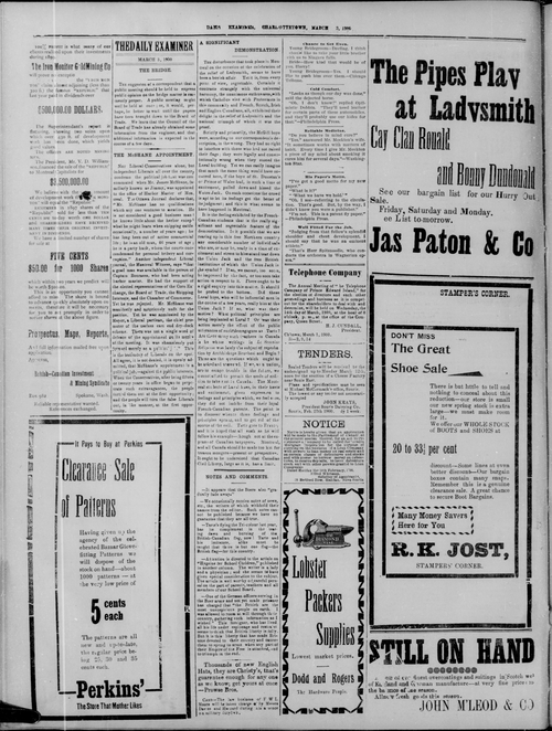 Title Examiner -- 1900-03-03 Date Issued 1900-03-03 Language English Type Text Genre Issue Rights Digitized with permission. For educational, research and study purposes. Member of Examiner Digitization Agency West Canadian Digital Imaging Inc. Issue 53 Volume 36