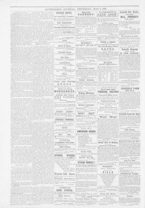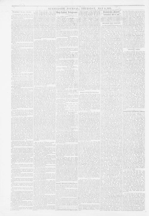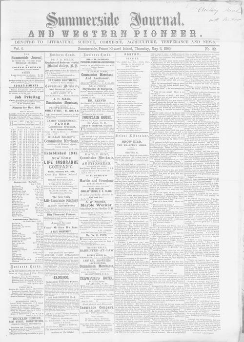 Title Summerside Journal -- 1869-05-06 Date Issued 1869-05-06 Language English Type Text Genre Issue Rights This material has been made available for research, education, and private use only. Publication, distribution or commercial use of the material requires permission from the copyright holder. Member of Summerside Journal Digitization Agency Robertson Library, UPEI Issue 32 Volume 4