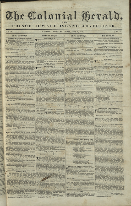 Title Colonial Herald and Prince Edward Island Advertiser, June 6, 1840 Date Issued 1840-06-06 Language English Type Text Genre Issue Rights This material has been made available for research, education, and private use only. Publication, distribution or commercial use of the material requires permission from the copyright holder. Member of Colonial Herald and Prince Edward Island Advertiser Digitization Agency Robertson Library, UPEI Issue 149 Volume 3