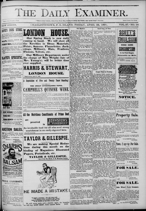 Title Examiner -- 1891-04-24 Date Issued 1891-04-24 Language English Type Text Genre Issue Rights Digitized with permission. For educational, research and study purposes. Member of Examiner Digitization Agency West Canadian Digital Imaging Inc. Issue 108 Volume 27