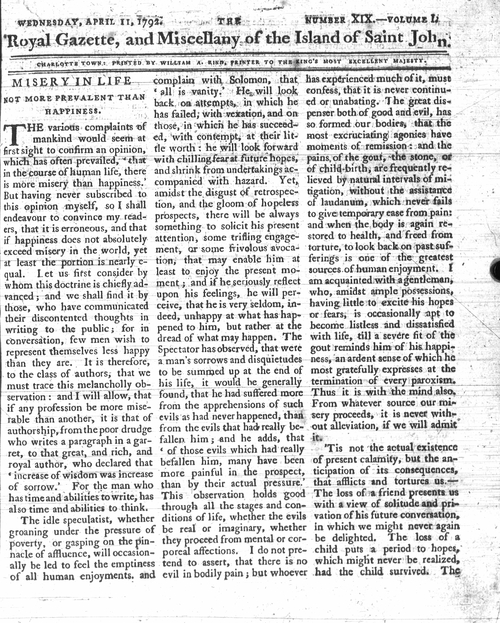 Title Royal Gazette, and Miscellany of the Island of Saint John -- 1792-04-11 Date Issued 1792-04-11 Language English Type Text Genre Issue Rights This material has been made available for research, education, and private use only. Publication, distribution or commercial use of the material requires permission from the copyright holder. Member of Royal Gazette and Miscellany of the Island of Saint John Digitization Agency Robertson Library, UPEI Issue 19 Volume 1