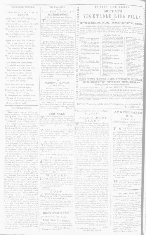 Title Morning News and Sem-Weekly Advertiser -- 1845-04-09 Date Issued 1845-04-09 Language English Type Text Genre Issue Rights This material has been made available for research, education, and private use only. Publication, distribution or commercial use of the material requires permission from the copyright holder. Member of Morning News and Semi-Weekly Advertiser Digitization Agency Robertson Library, UPEI Issue 63 Volume 2